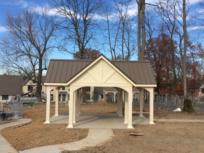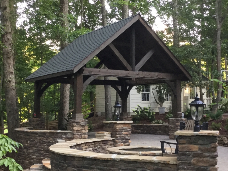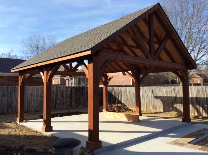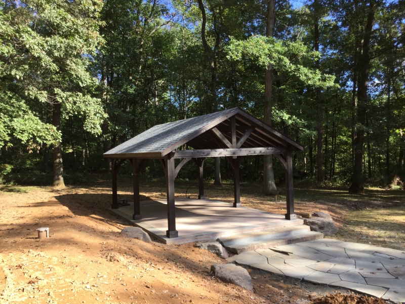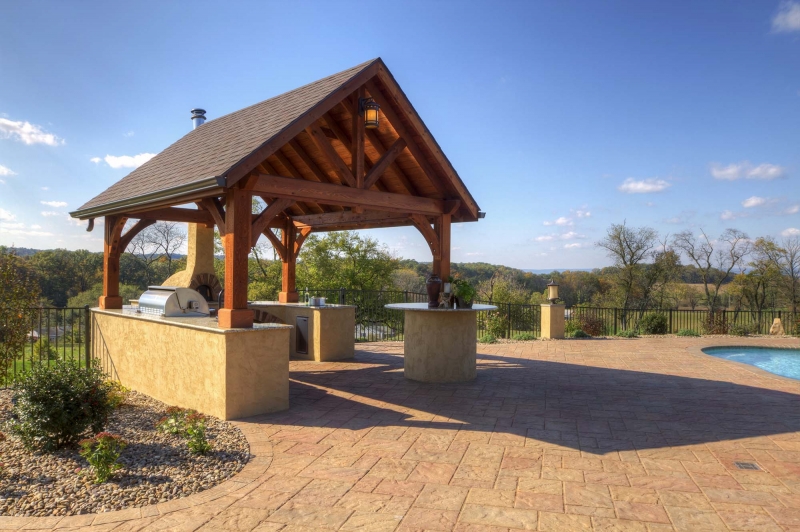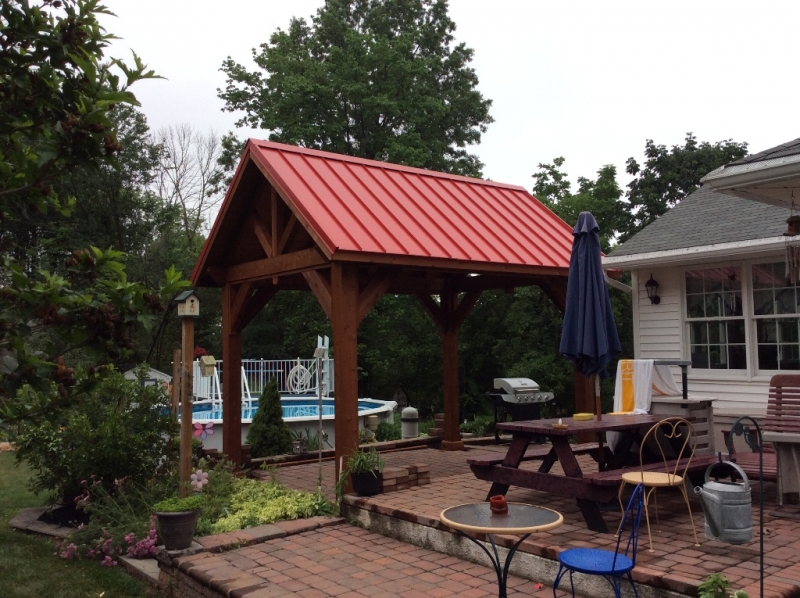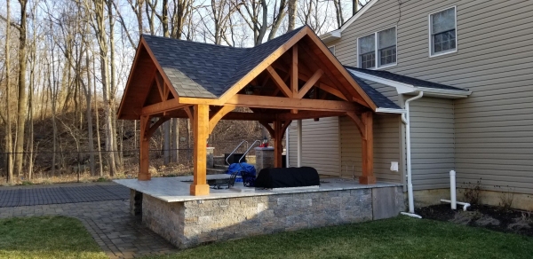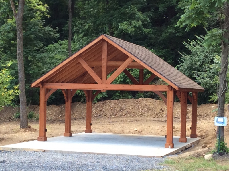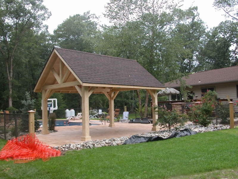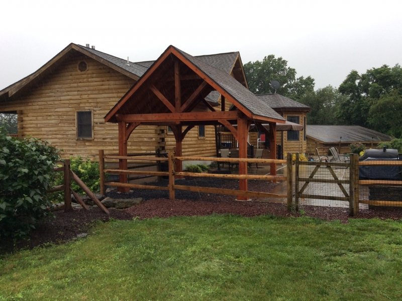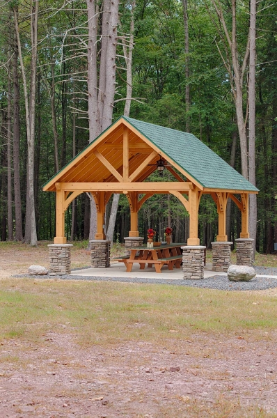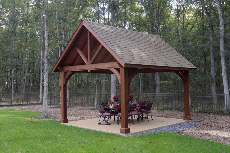The roof is engineered with double main rafters for structural integrity. We use tongue and groove 1 x 6 boards for the ceiling covered with architectural asphalt shingles. Our pavilions are engineered to withstand 140 mph winds and 45 pounds per square foot snow loads. All this is standard with our Alpine pavilion for a strong and beautiful structure in your backyard. Many options are available like metal roof, curtain shade system and more.