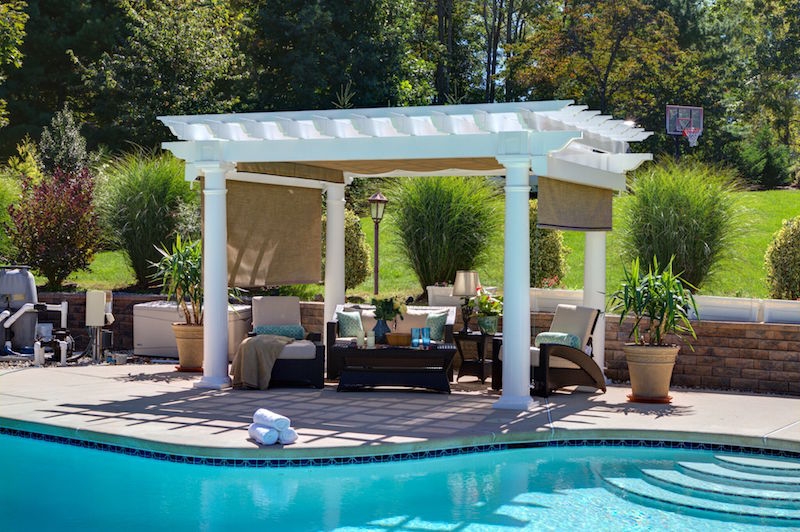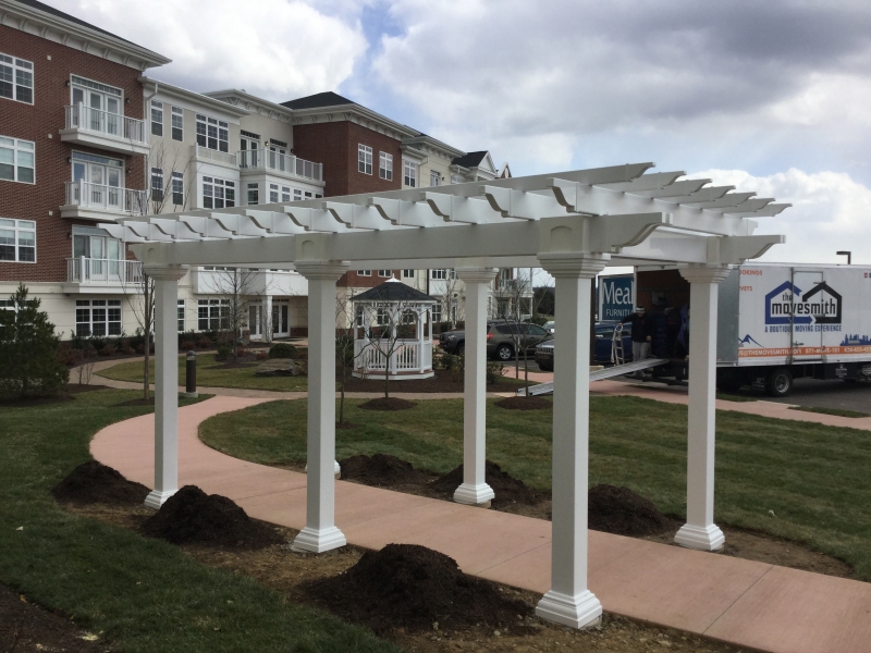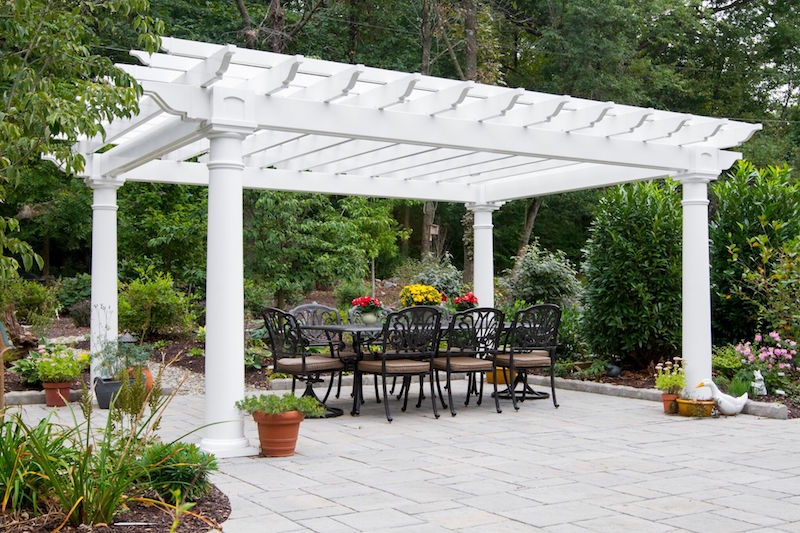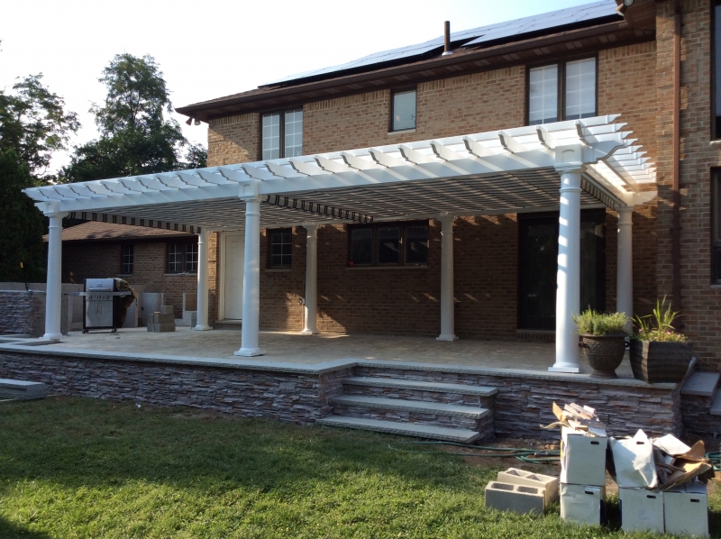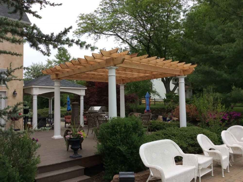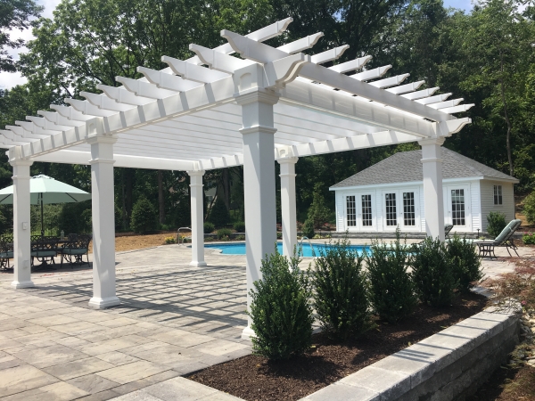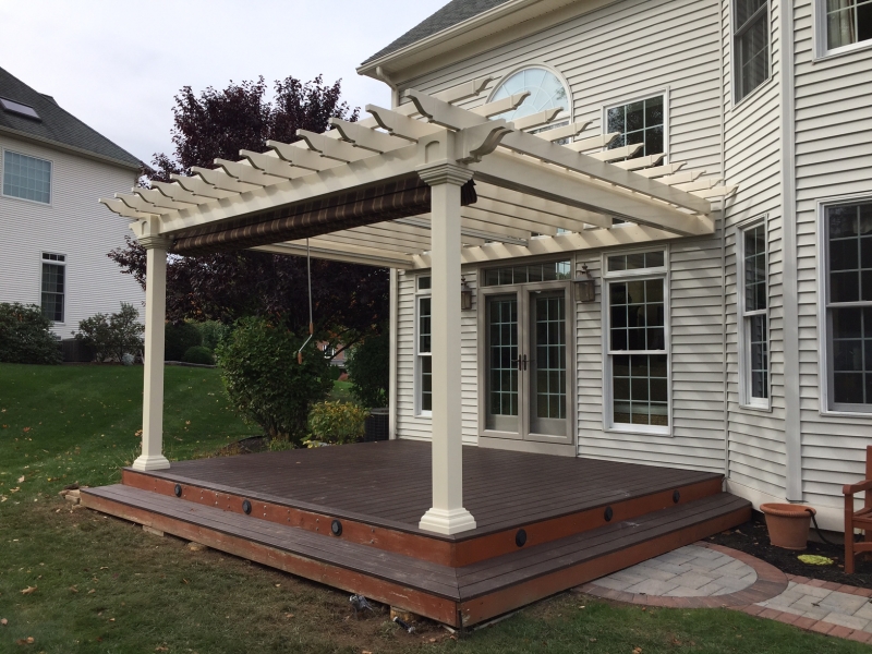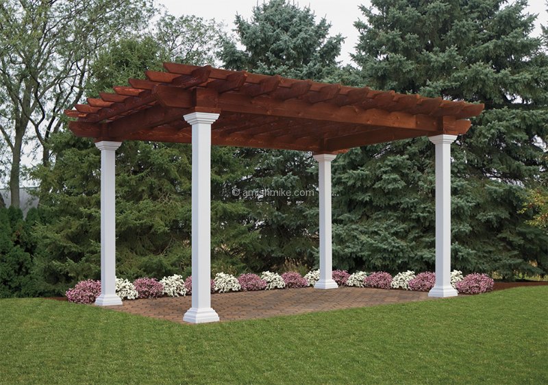 The Artisan Pergola features are hemlock or cedar wood top stained to your choice of one of our more popular wood colors. Pressure treated wood 6 x 6 post sleeved in white vinyl with a decorative post skirt. Double ply 2 x 8 headers on all four sides create a completely finished look. 2 x 6 joists (rough cut) span the longer side, notched together for strength and resist warping. We include engineered anchor brackets for anchoring to concrete, patio and decks. Many options are available including a shade system, larger posts, round columns and more! Contct usfor more details.