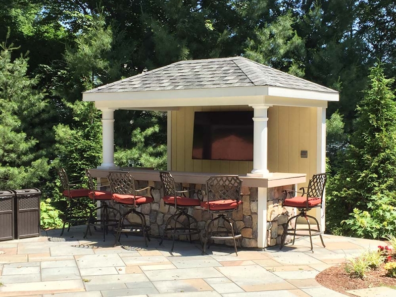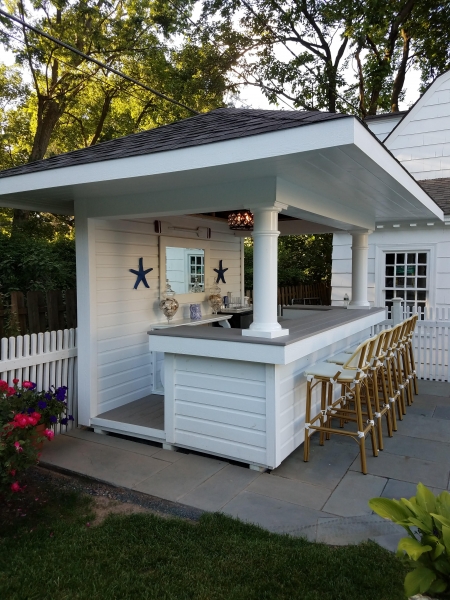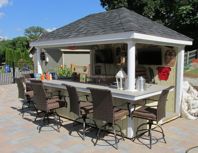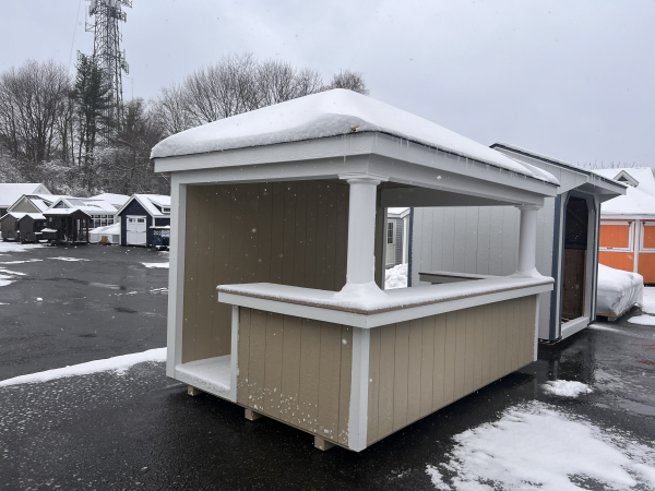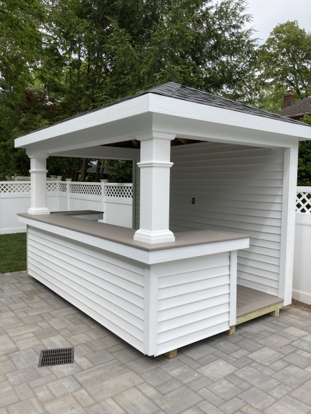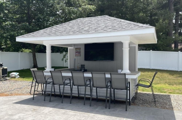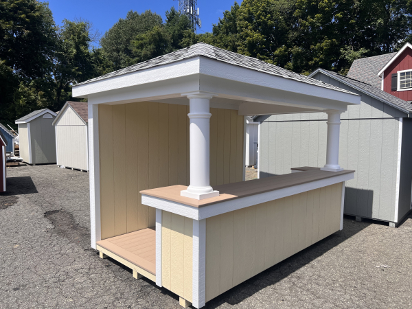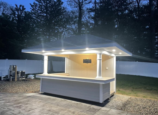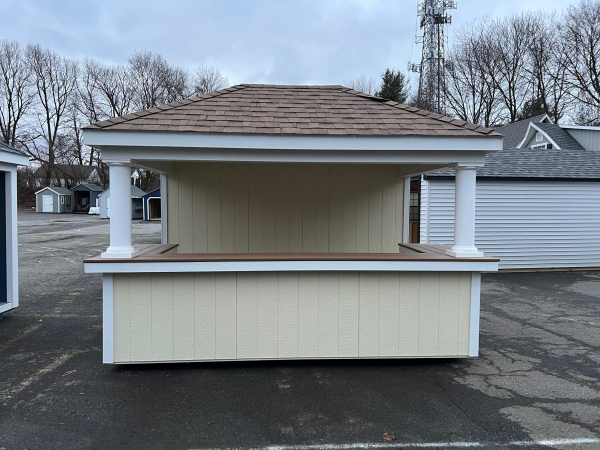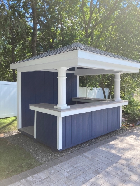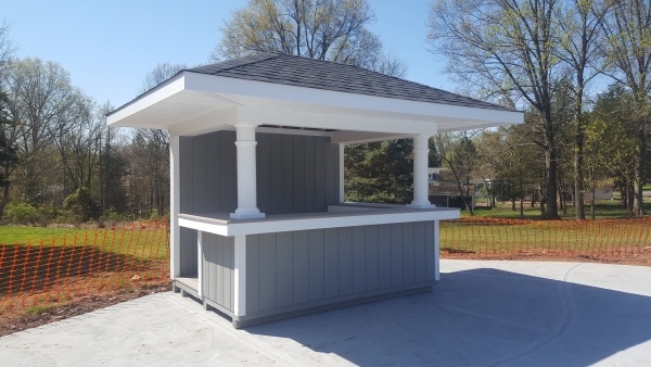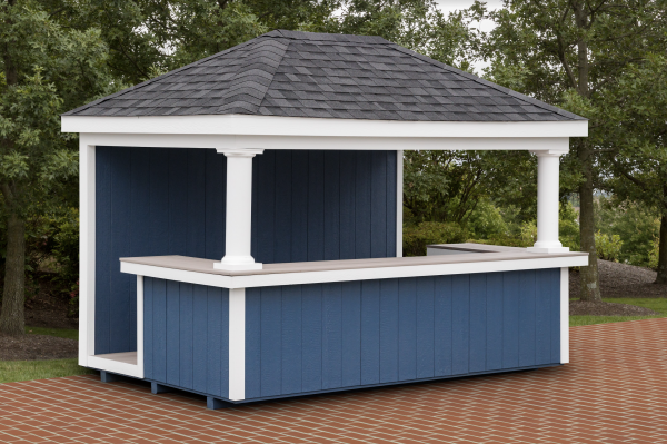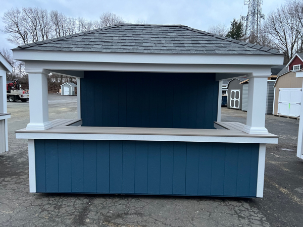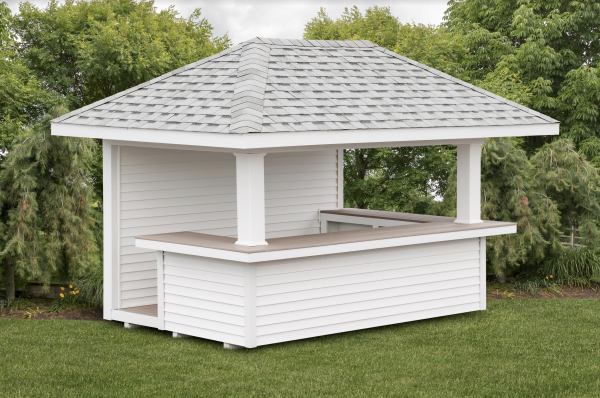 Very similar to the Limerick pool house, this pool house features a complete open feel with a U shaped bar/counter. The counter is made from trek and is available in two colors (gray or tan). The floor of this pool house is made from the same trek material. It features a hip style roof line but can also been done in the A frame style. This pool house can be custom ordered in your choice of colors. Additional options like vinyl siding, cedar shakes, metal roof, stone facing can be added.