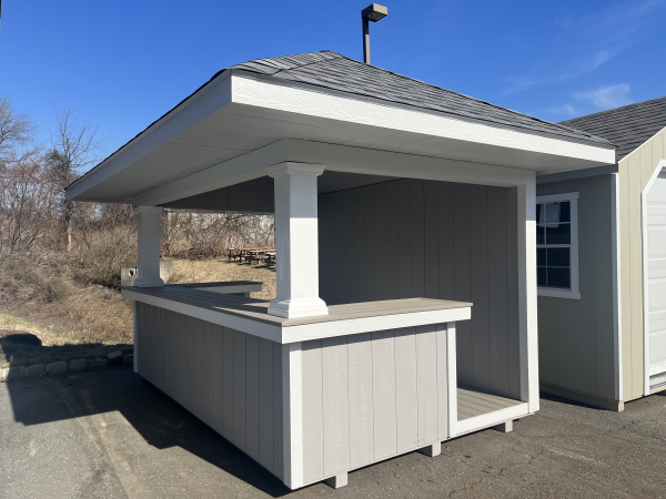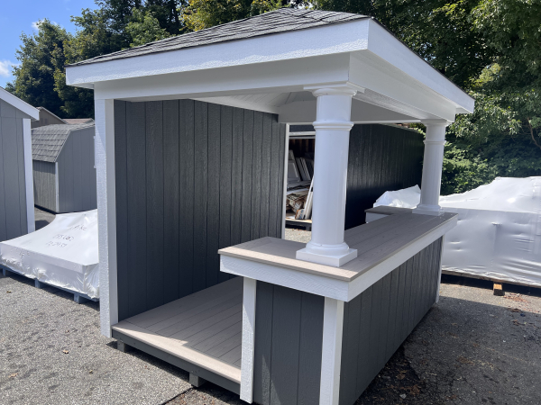 8x10 Breakaway with Duratemp T1-11 Lite Gray; Added 2' Overhang, Dual Black Shingles, Gray Treks Counter+Floor; J-Shaped Bar