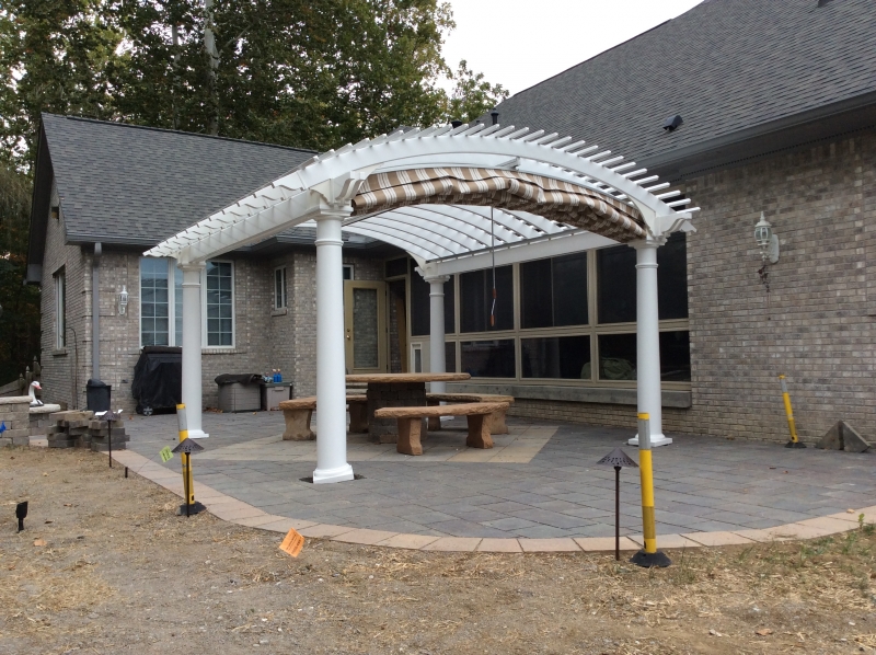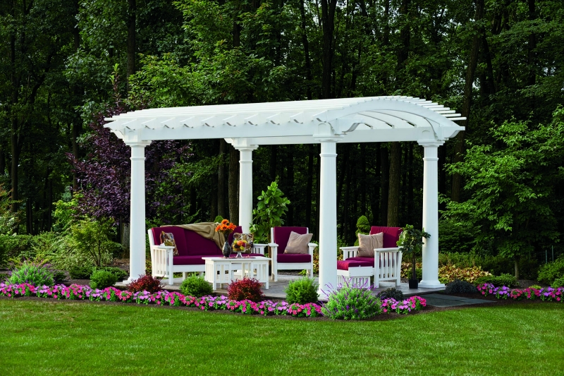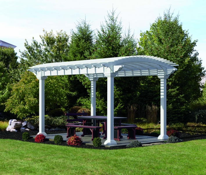 In the Arcadian Pergola Series the standard features are a maintenance free vinyl top with a solid 6 x 6 pressure treated post sleeved in a white vinyl and decorative post skirt. Double 2 x 8 headers with pressure treated wood sleaved in white vinyl for strength and and non sagging appearance. Full width 2 x 6 rafter joists that span across the shorter side and 2 x 2 runners span the longer side. Anchor brackets for anchoring to concrete, patio and decks. Many options are available, including round columns.