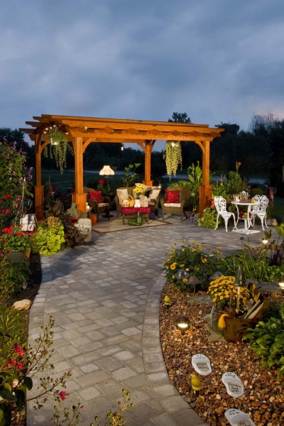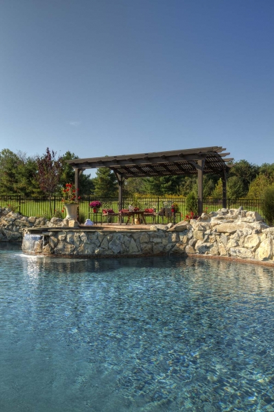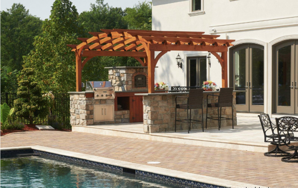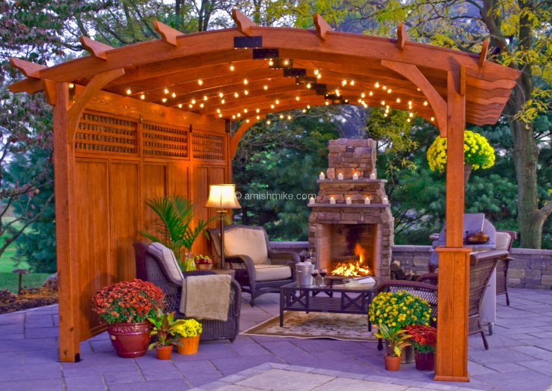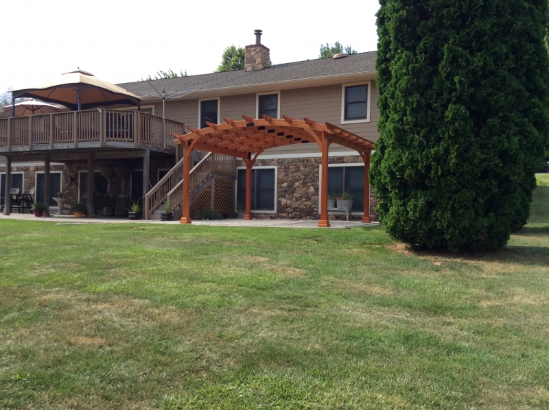 The Hearthside Pergola standard features are solid laminated 5 x 5 pressure treated posts with a decorative post skirt, 2 x 6 arched joists utilizing engineered connection brackets for strength. Arched rafters span across even measurement side and 2 x 6 runners with scalloped ends spans odd side. Both notched intersections to resist warping. Triple ply 2 x 8 header for added strength to maintain a straight non-sagging appearance, anchor brackets for concrete, patio and deck’s. Available in cedar, canyon brown, cinder, and mahogany stain finishes. Many other options available. Please contact us for details.