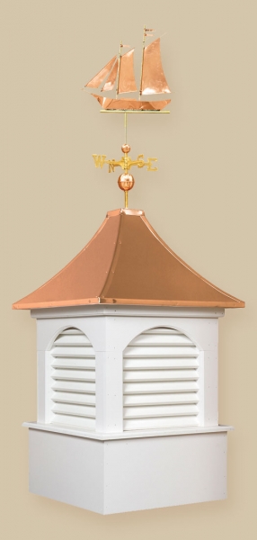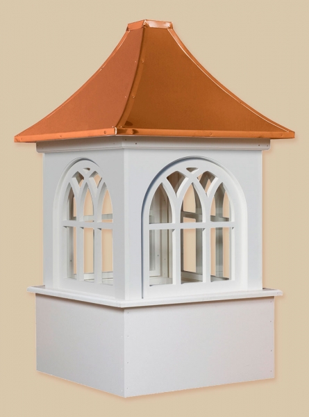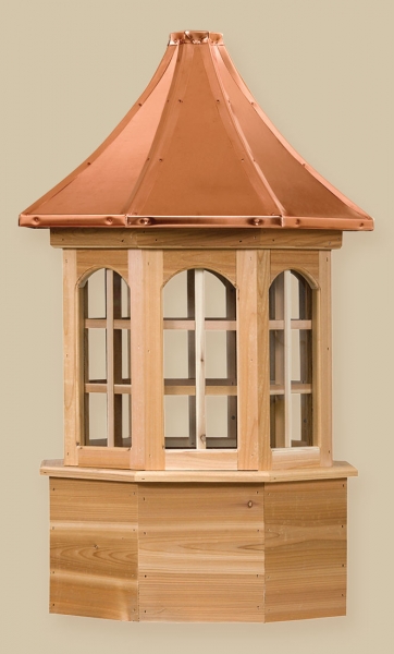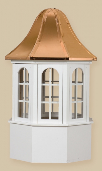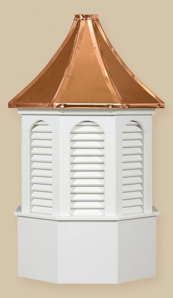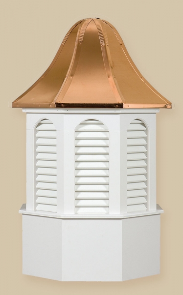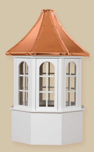 Estate Series Cupolas are available in both vinyl and wood materials.. The Estate Series Cupolas are elegantly designed and will make a great addition to your home, garden, barn, gazebo or any other building. These cupolas are constructed of a Vinyl-PVC trimboard (a maintenance-free product) or a select grade of western red cedar and capped with a copper roof. The base sizes are 24″, 30″, 36″, 42″, 48″, 60″, and 72″.