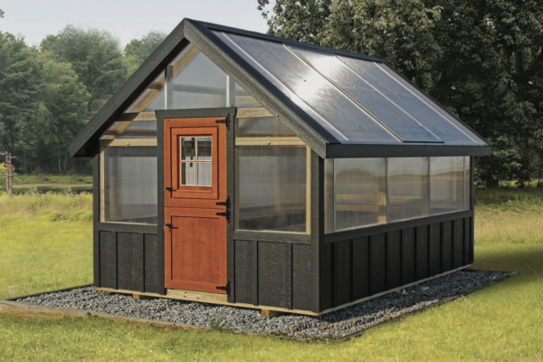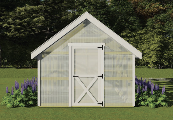 Pressure Treated Foundation Timbers & Framing, 9/12 Roof Pitch, 5’6” High Sidewalls, Commercial Grade Polycarbonate Walls & Roof, MiraTec Exterior Trim, Single Entry Door, Two Manual Roof Vents, Anchor Kit, Floor not included