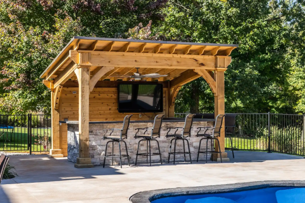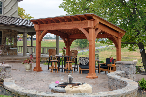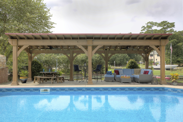 Amish Mike’s outdoor pavilions provide a shady oasis in your backyard away from bugs and harsh sunlight. It can be the perfect backdrop for the glimmering pool providing ample space for outdoor furniture and allow a cozy meal under the shade.