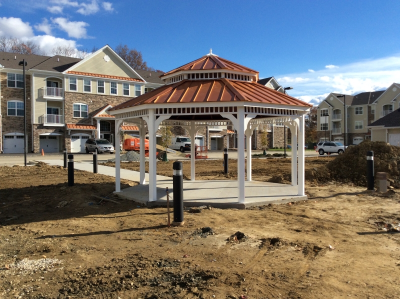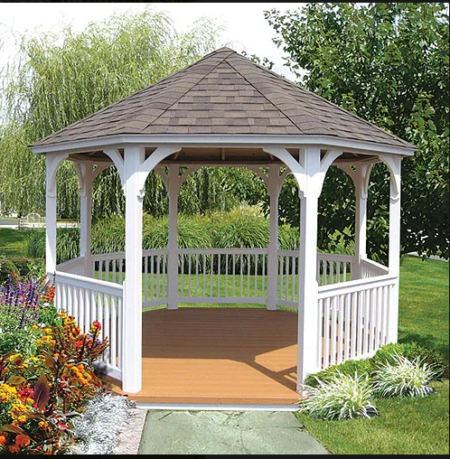 Our line of vinyl gazebos features many different models and designs, including octagon, oval, standard oval and rectangle. We offer these gazebo models with a pagoda roof, steeper roof pitches, bracket designs and spindle packages. Our vinyl gazebos are made with white vinyl with a pressure treated wood core to meet all engineering specifications and code. The floor is done with trek flooring available in gray or tan. Other color choices are available for an additional charge. The roof is constructed with asphalt shingles on a tongue and groove pressure treated overlay. You have the choice of staining or not staining the the inside roof underlay with any choice of Cabot colors. For an additional charge, you can also get cedar shakes on a vinyl gazebo.